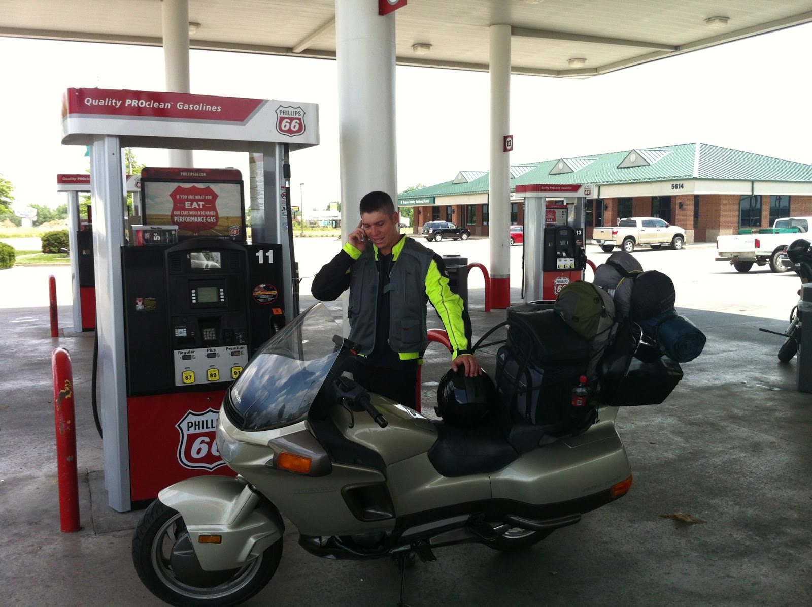Packing all the equipment of the motorcycle is quite a production and slowly we are getting better at at. Right as we were leaving we did our morning maintenance check and noticed that Uri's front tire had a leak. Luckily we were a mile away from a Harley Davidson shop and drove there right away. They were really nice and fixed Uri's front tire and even gave him a few spare parts for the future.